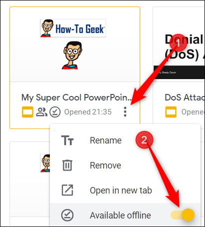 To save storage space on your local machine, Google only downloads and makes the most recently accessed files available offline. To manually enable a file, click the three dots icon, and then toggle “Available Offline” to On.
